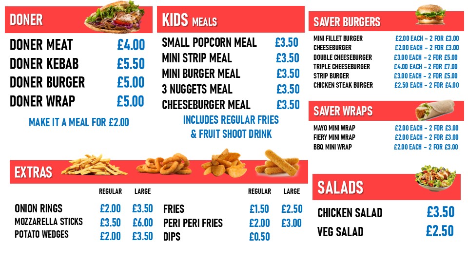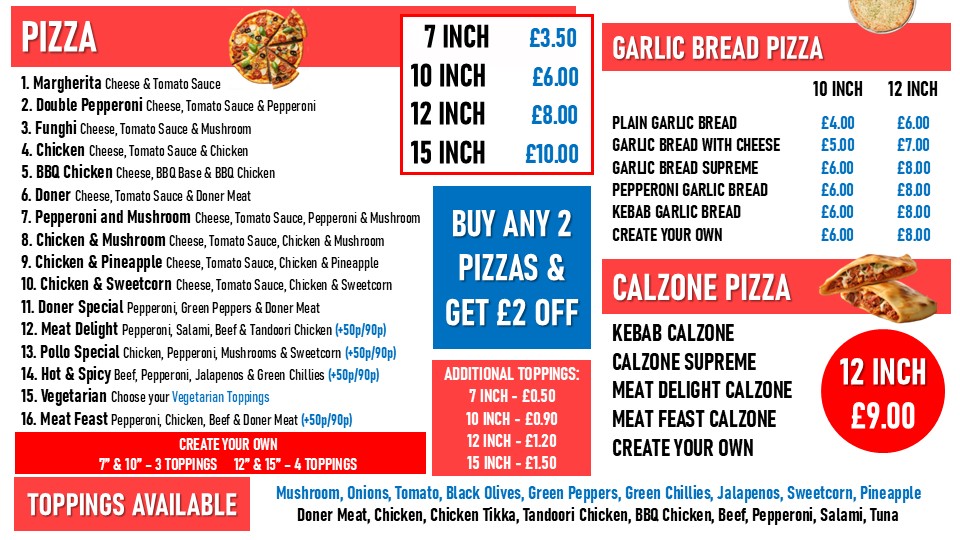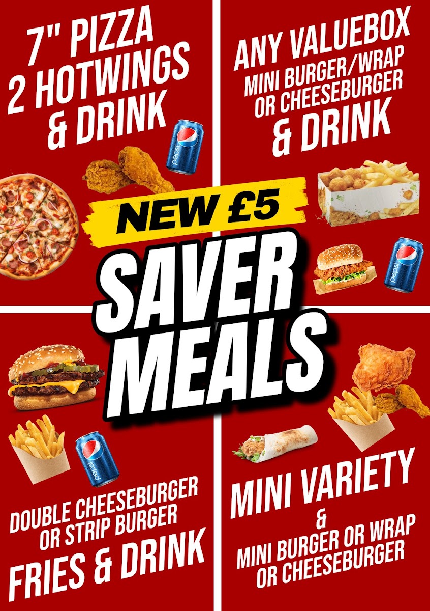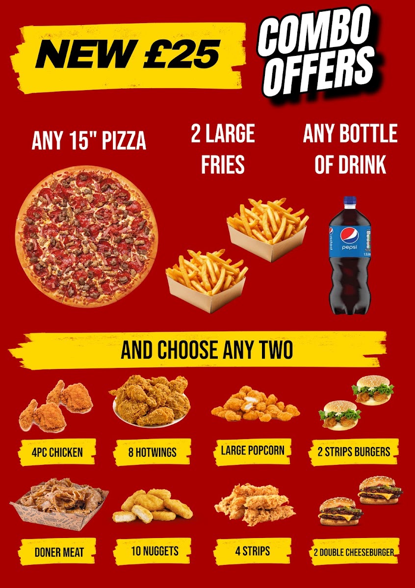 ( £25 combo offer) 15" pizza, large fries, bottle drink & choose 2 options from below: 4pcs Chicken,8pcs Hot Wings,Large Popcorn,2x Strip Burgers, Doner Meat, 10pcs Nuggets,4pcs Boneless Strips, 2x Double Cheeseburgers
