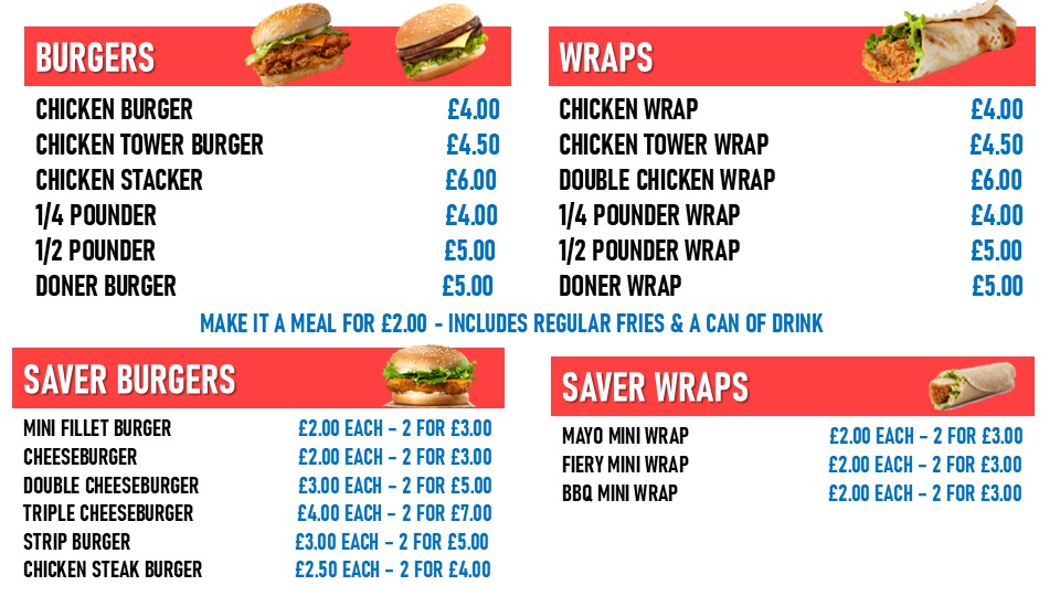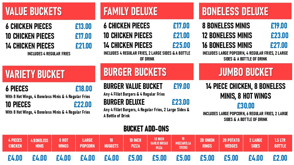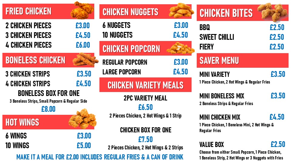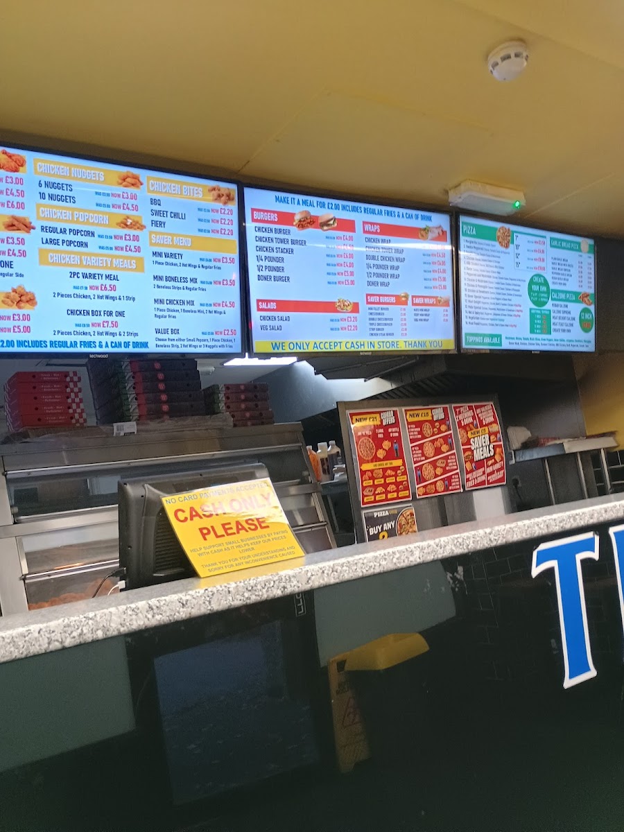 The menu at Tfc Bedford offers an extensive range of delicious meals, catering to all tastes and appetites. Pizza lovers can enjoy a variety of options, including 7" Pizza, 10" Pizza, 12" Pizza, and 15" Pizza, with options to create your own. If you're in the mood for something more filling, the 2x 15" Pizzas or 2x 12" Pizzas combos are great choices. The restaurant also offers a selection of fried chicken, with options like 1pc Chicken through to a hearty 6pcs Chicken. Burgers are a highlight, with items like the Mini Fillet Burger, Strip Burger, and the indulgent Double Cheeseburger. For something a little more adventurous, the Chicken Tower Wrap and Doner Kebab in Pitta are flavorful picks. The menu also includes Cheesy Loaded Fries, with choices like Cheesy Loaded Fries With Chicken or Cheesy Loaded Fries With Doner, as well as Rice Boxes such as the Chicken Rice Box. Calzones come in a variety of mouth-watering flavors like the 12" Kebab Calzone Pizza or the 12" Meat Feast Calzone Pizza. For those with a sweet tooth, there’s an impressive selection of desserts including Chocolate Fudge Cake, Banoffee Pie, and Black Forest Gateau. Whether you’re grabbing a meal for one with options like the Mini Boneless Box or sharing with a Jumbo Bucket, Tfc Bedford's menu offers something for everyone. Add some Regular Fries, Mozzarella Sticks, or a refreshing 330ml Pepsi Can to complete your meal.