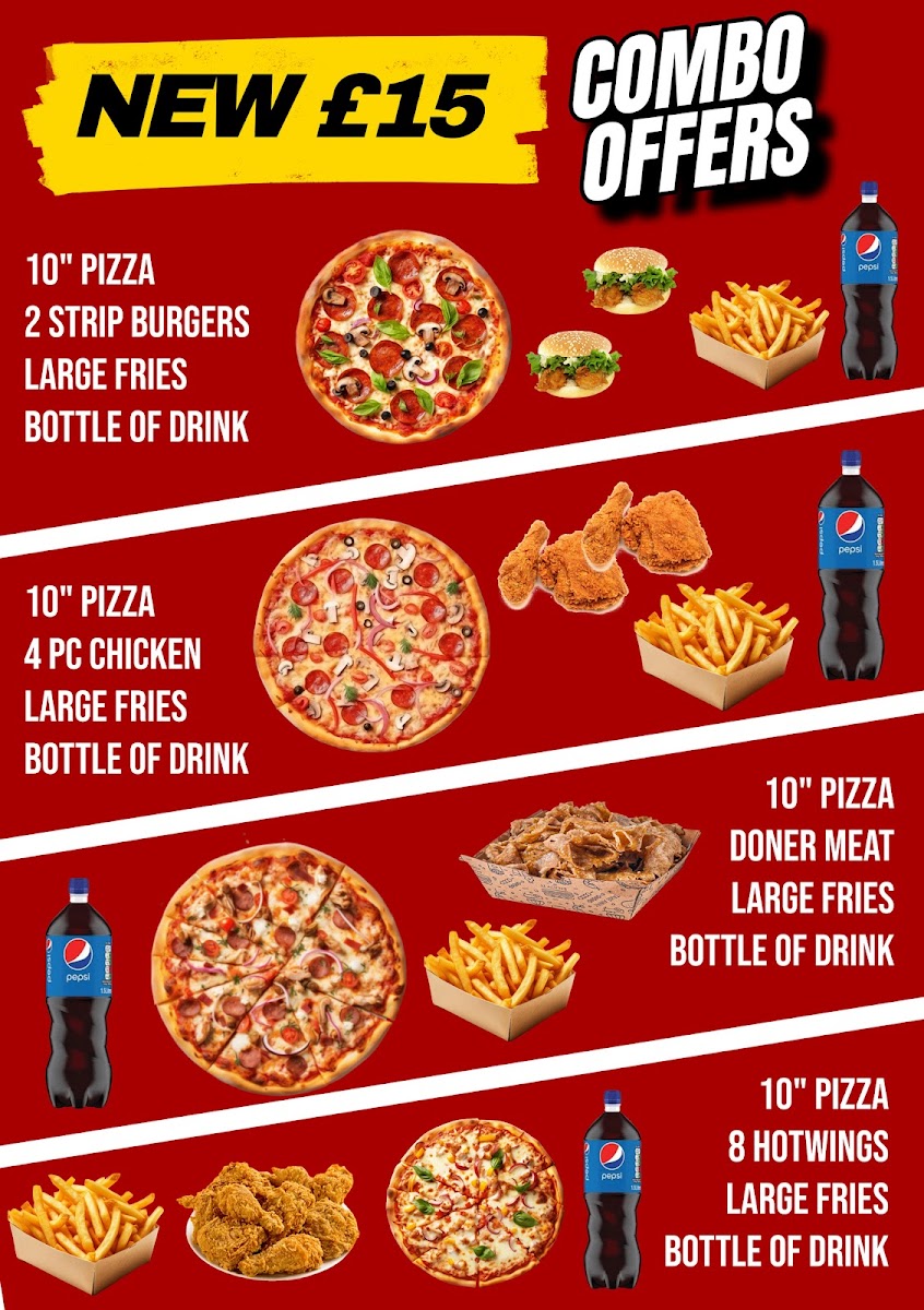 (£15 combo offer) 10" pizza, 2x strip burgers,large fries & bottle drink.
